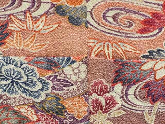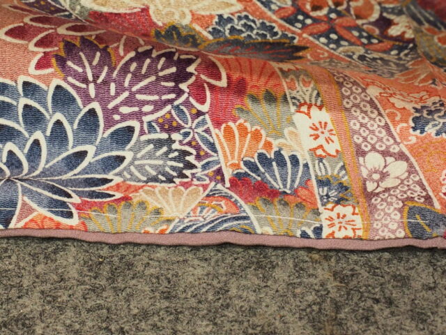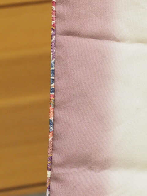 綺麗な友禅染の袷きものです。こちらの生徒さんは袷は3枚目ということですが、今回初めて縮緬の生地での仕立てにチャレンジしました。