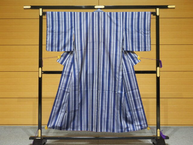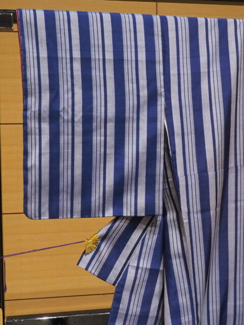 さて本日最後の作品は同じくきもの技術科の生徒さんが仕立てた滝縞文様の袷きものです。