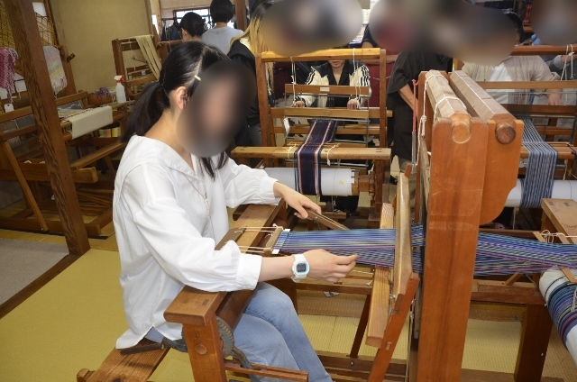こちらでは2つのグループに分かれて機織り体験をさせていただきました。建物の中に入るとずらりと機織り機が並んでいます。