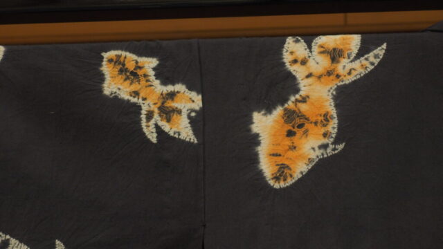 金魚の文様を縫い絞りと巻き絞りの技法で表現した作品です。