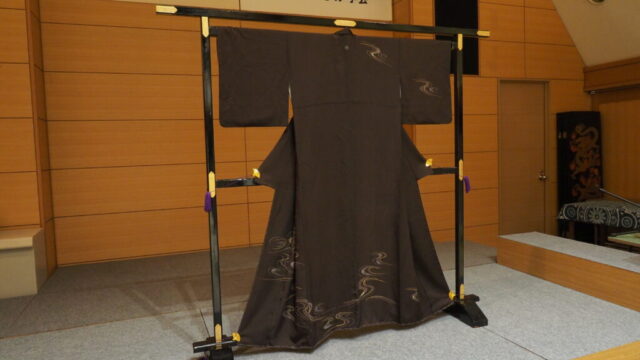 それではまずきもの芸術科2年の生徒さんの作品をご覧いただきましょう。先輩にもらった訪問着を自分の寸法に仕立て直したものだそうです。