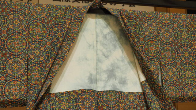 そして注目は羽裏(羽織の裏地の部分)です。こちらの生徒さんは友禅染の授業でこの羽裏の生地を染めたそうです。