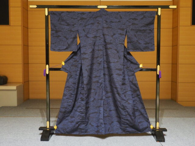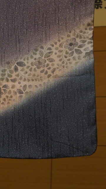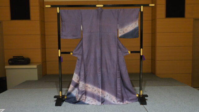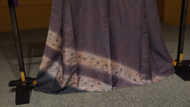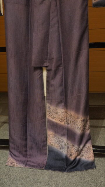紫の地色に袖と裾の辻が花風の文様がおしゃれですね。