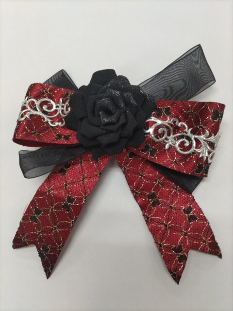 オーガンジーのリボン布でリボンを作り、つまみ細工でバラの花を作ったものを組み合わせたものでそうです。