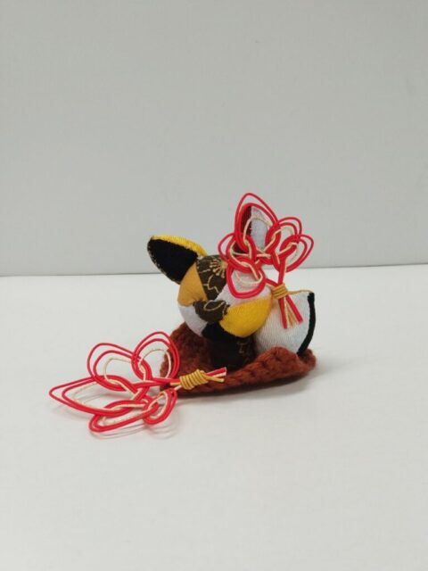 さて本日最後の作品はきもの芸術科1年生の生徒さんが制作したパッチワークのぬいぐるみと水引です。