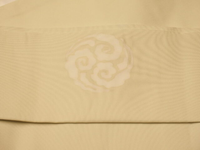 画像では少し見えにくいのですが、帯の前柄はこのようになっています。家紋にも用いられる「三つ雲巴」ですね。