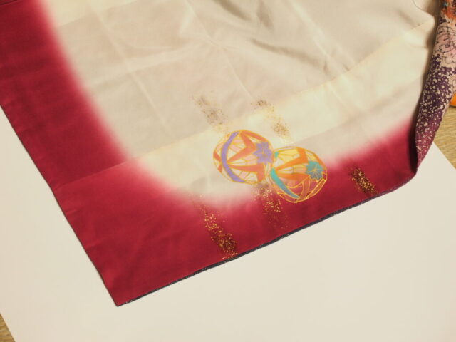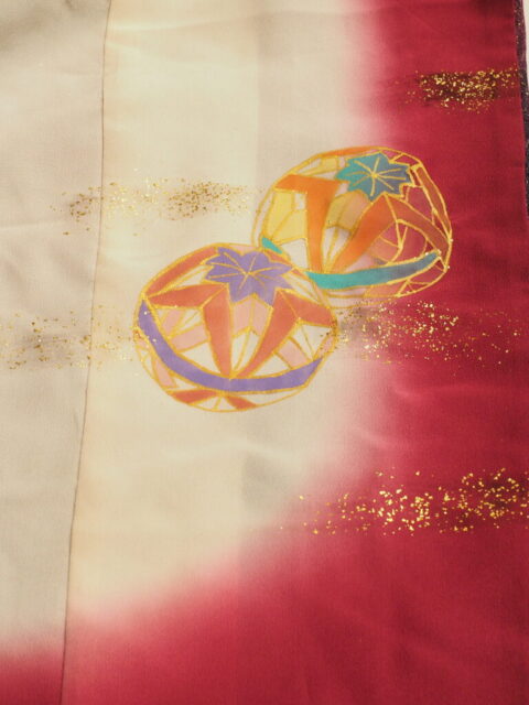 以前に仕立てた振袖の八掛の部分に手毬の文様を描き加えて金彩をほどこしました。