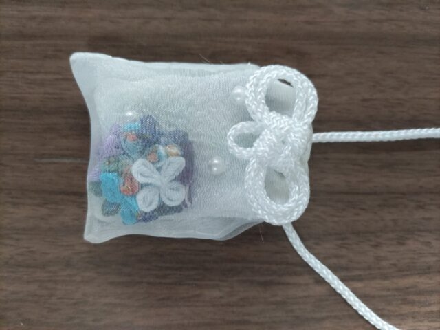 そしてつまみ細工を中に入れた薄く透ける生地で作った袋物です。