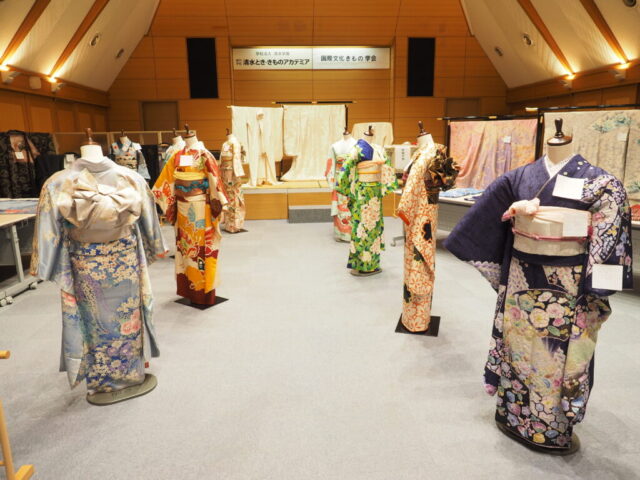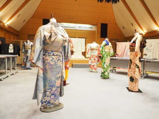 今回は着装編です。本校では週1~2回年間を通して着装の授業があります。浴衣の着付けから礼装の着付けまでさまざまなきものの着装方法と数多くの帯結びを学び、最後は自分で考えた創作帯結びまで到達できるように授業の中で学んでいきます。
