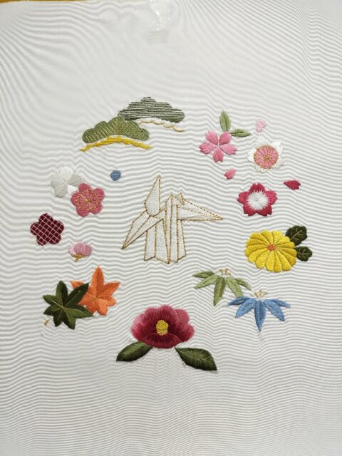 日本刺繍もきものを制作する上での大切な技術の一つです。糸を一本ずつ手の技で繍(ぬ)っていく日本刺繍の技法はフランス刺繍などの西洋刺繍とも中国刺繍などのアジアの刺繍とも異なる独特の伝統芸術です。