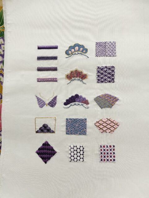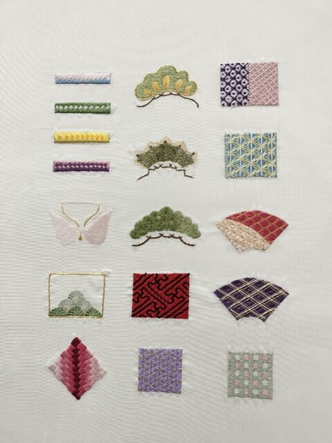 それではまず日本刺繍の作品からまいりましょう。下記の3点は基礎縫いです。