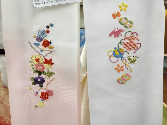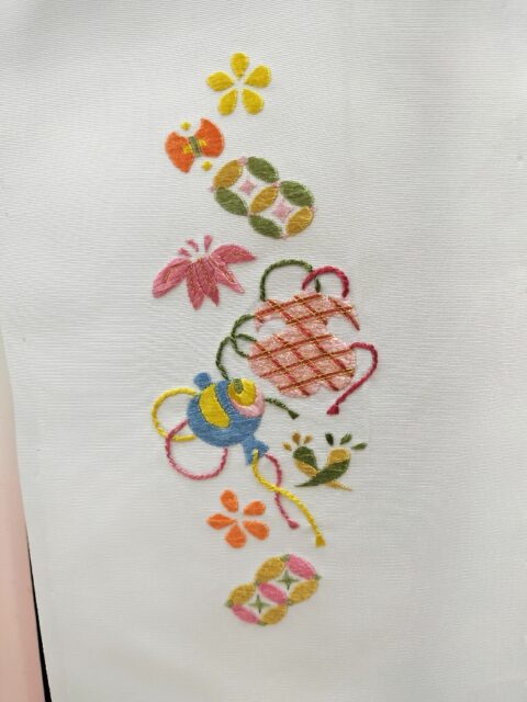 こちらは半衿です。宝尽くしのかわいい文様と、好きな歌舞伎でお姫様が着ていたきものの袖部分にあった刺繍とほぼ同じ文様にしたそうです。どちらも素敵ですね。
