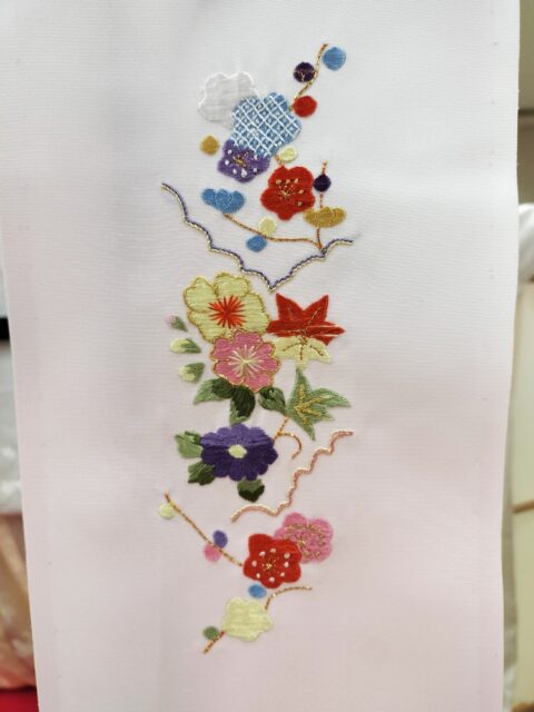 こちらの生徒さんも刺繍で藤の花の半衿を作りました。振袖の地色とマッチしていますね。