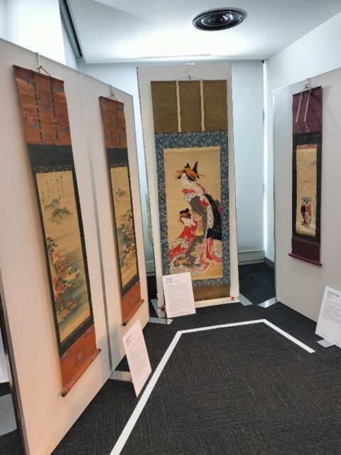 きもの芸術館からは友禅染の語源となった宮崎友禅斎の掛け軸や喜多川菊麿など肉筆の浮世絵4点を展示させていただきました。