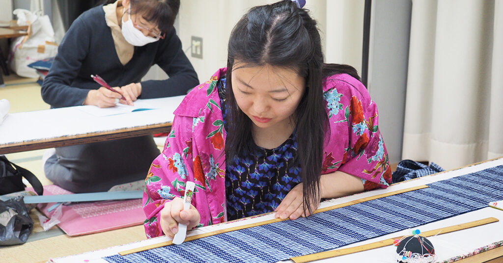 きもの制作に関するを技術を幅広く総合的に学べる学科です。和裁や着装の他に絞り染めや友禅染めの技法も学びます。